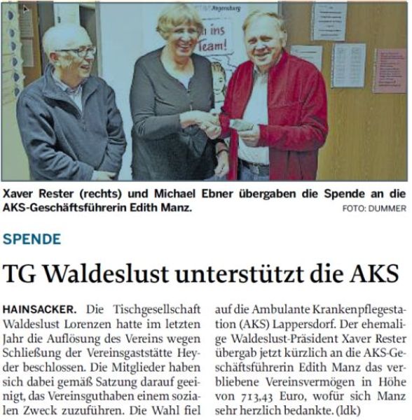 MZ-Bericht vom 15.01.2019 : Spendenübergabe von der TG Waldeslust Lorenzen Geschrieben am 15. Januar 2019. Veröffentlicht in Aktuelles. Spendenübergabe von der TG Waldeslust Lorenzen Weiterlesen